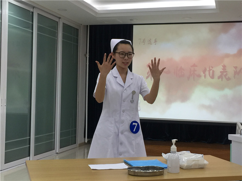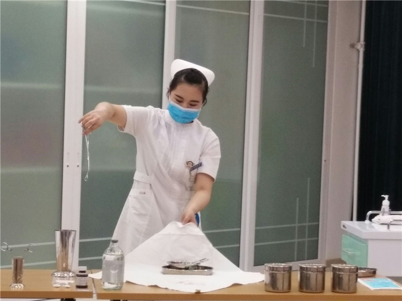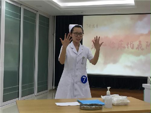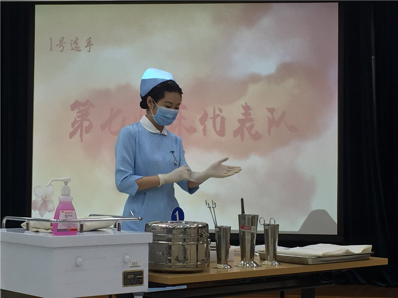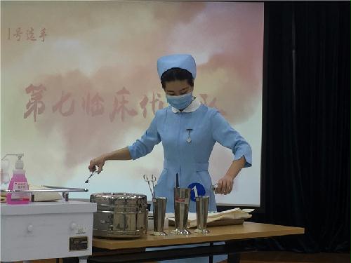 惊鸿宛转蛾眉,才向光华星斗。不同于优美的“英姿秀”板块,“展技能”板块不仅促进了对基础护理技能的重视与提升,更让大家对护理专业操作中严谨的态度有了更深的认识。选手们在对病人亲切关心的同时,更多的是操作的严谨性,聚精会神,一丝不苟。第一轮比拼过后,第一、四、七临床护理教学部晋级第二轮无菌操作技术比试环节。竞赛现场众,选手的每一个动作都会被无限聚焦和放大。她们严格遵守无菌原则,严格执行三查七对,标准规范不失落落大方,对现场把控得游刃有余,看得出每位选手都在大赛前做了充足的准备。比赛现场还特设了观众问答环节,出现在大屏幕上的护理专业考题给了现场观众同学们过把小瘾的机会,大家热情高涨,积极参与。岳鹏老师在点评选手们的操作环节时充分肯定了选手们的表现,同时提到借助这样一个交流展示的平台,将积极推动七个临床护理教学部及本部之间的教学交流,今后还可以借助各学部集体备课进一步探讨,更好提升教学质量。