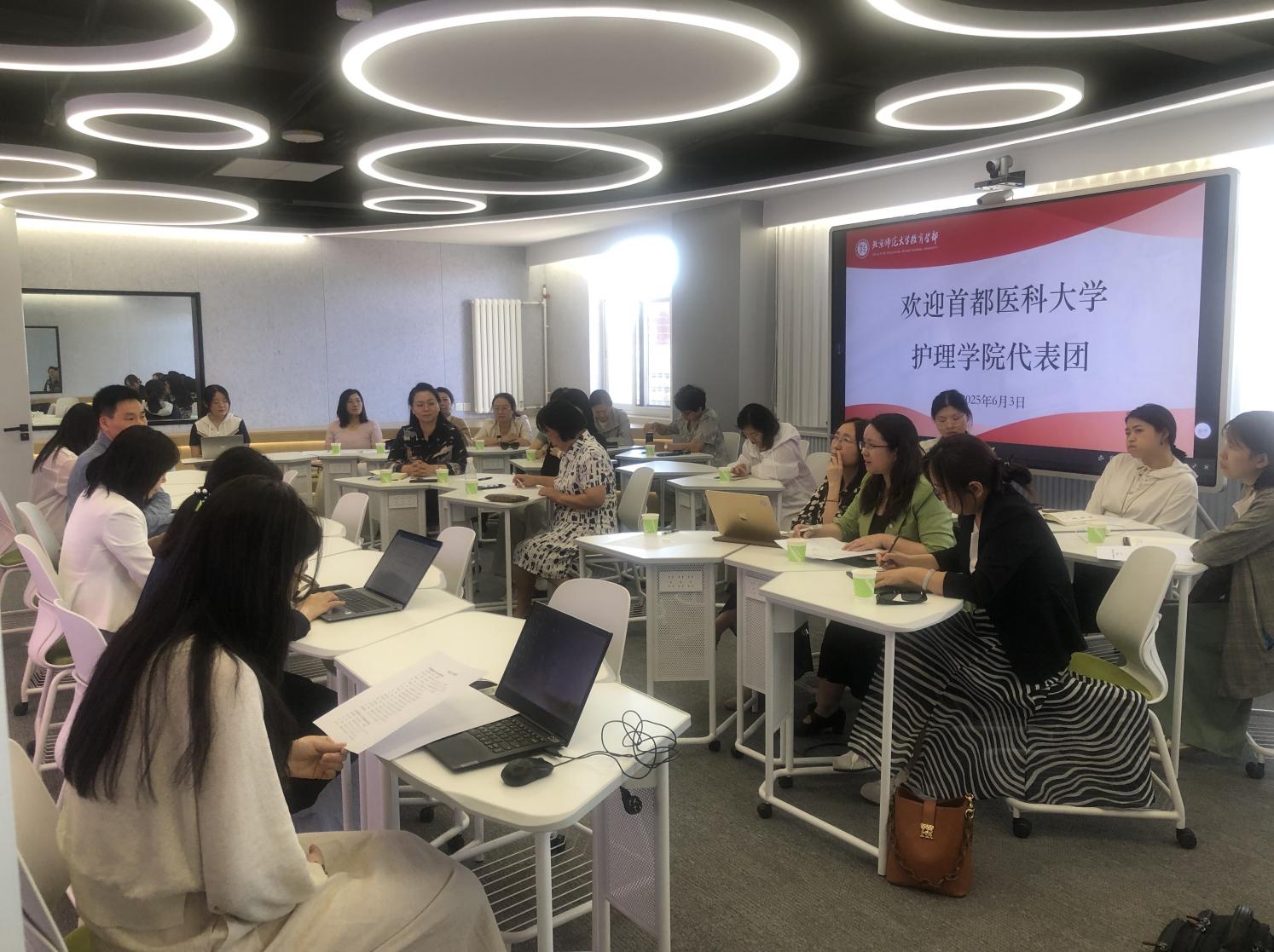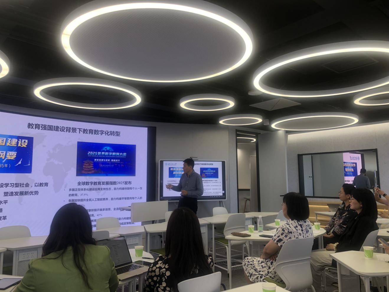 本次调研座谈会在北京师范大学科技楼智慧教室举行。会上,工作人员现场演示了智慧教室的各项功能、特色设计与教学成效。李玉顺从数智化技术对高等教育创新的影响、教育学部慕课发展中心建设与发展、数字化转型、智能化升级下的实践三个方面分享了北师大教育创新举措。张婧婧分享了北师大教育研究的发展,教育类研究课题的申报思路,智能技术在教育中的应用,尤其在创新教研机制、营造创新氛围、助力教师发展方面分享了重要思路。会上,双方围绕教育教学改革、科研课题协同、人工智能技术赋能等核心议题展开深度对话与讨论,共谋“十五五”发展时期战略合作新路径、新举措。